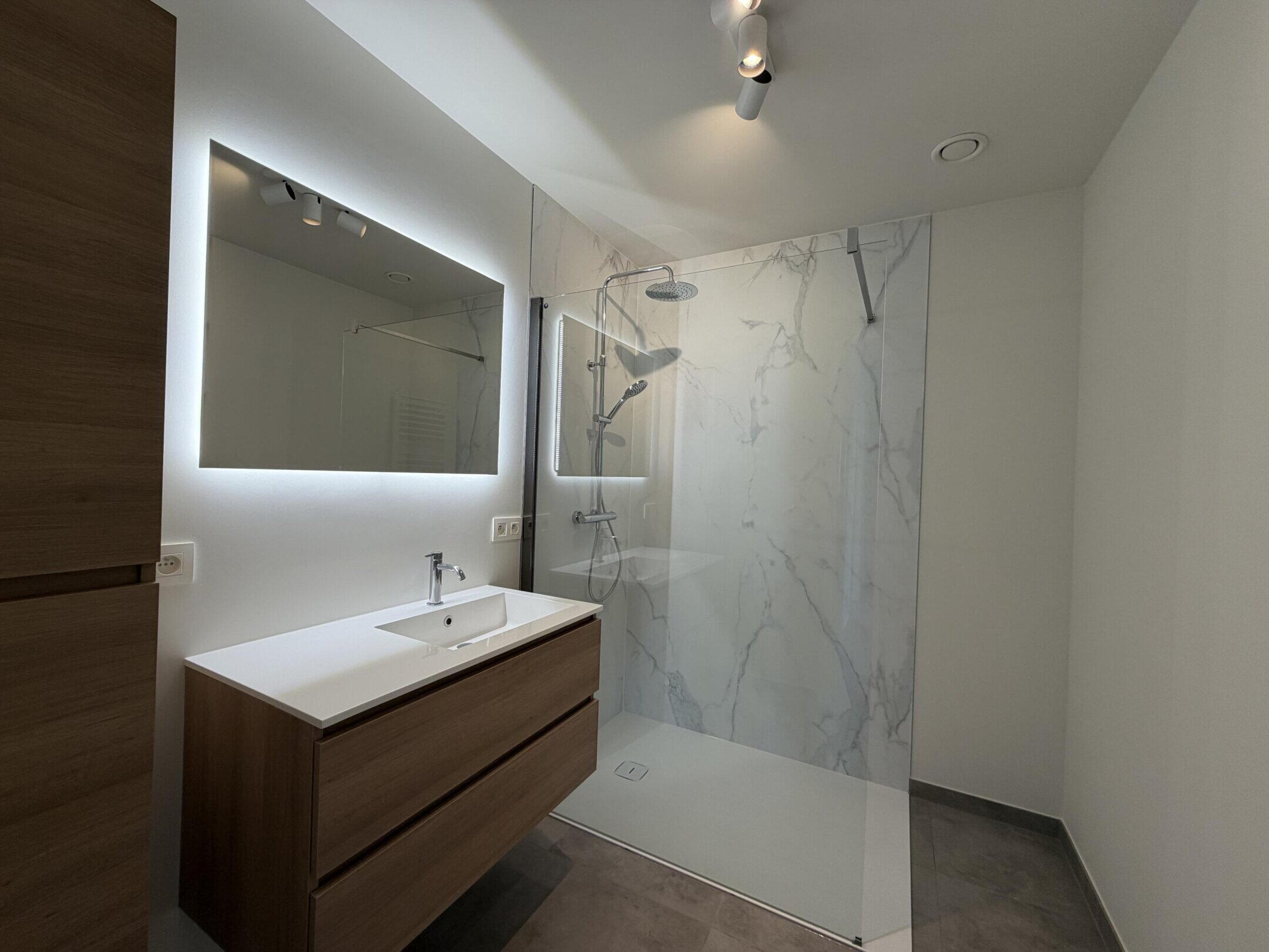 - Badkamer met badkamermeubel met lavabo, inloopdouche en handdoekradiator.